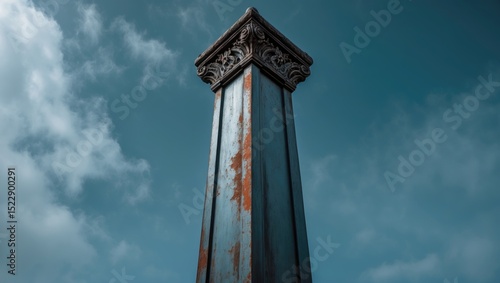 A unique iron pillar that does not rust, tall column against the blue sky with carved ornaments at the top.
