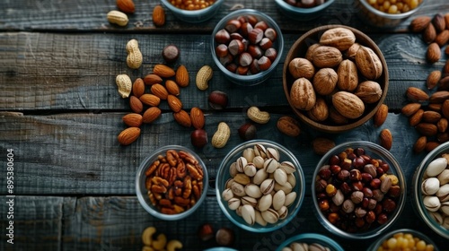 A variety of nuts and dried fruits in small bowls, top-down view, warm and natural tones, highly detailed