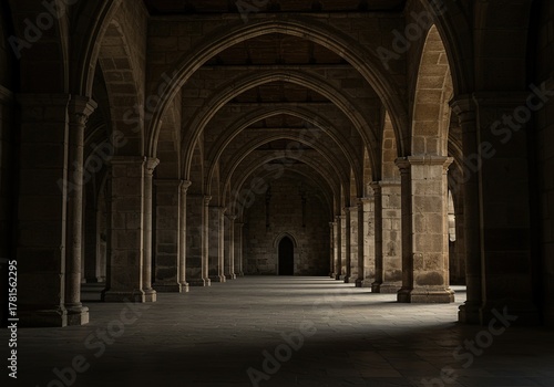 A vast, ancient hall stands in profound silence, its colossal stone arches reaching upward. Shadows deepen the reverent atmosphere of this hallowed space ,vast ,ancient ,arch