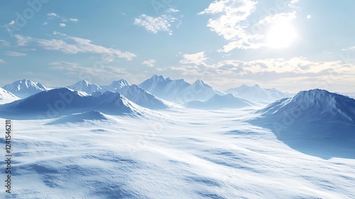 A vast mountain range covered in pristine white snow, with sunlight reflecting off the icy peaks and creating a breathtaking view