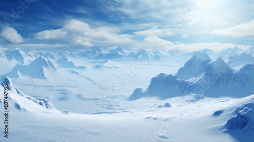 A vast, snow-covered landscape with mountains in the background. The sky is clear and blue, and the sun is shining brightly.