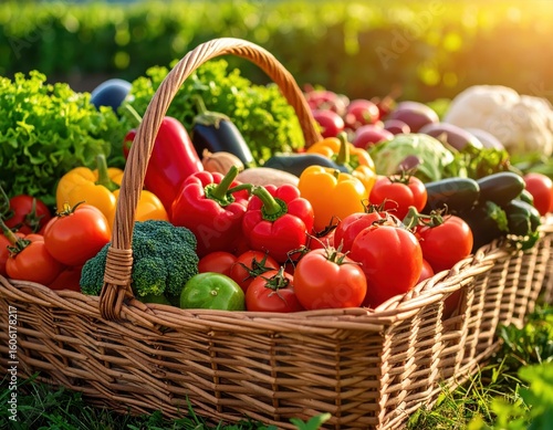A vibrant assortment of fresh organic vegetables in a wicker basket, basking in sunlight in a lush garden.