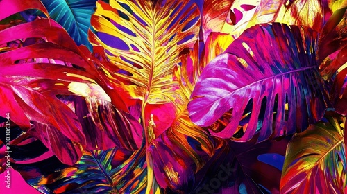 A vibrant, colorful arrangement of tropical leaves in various hues.