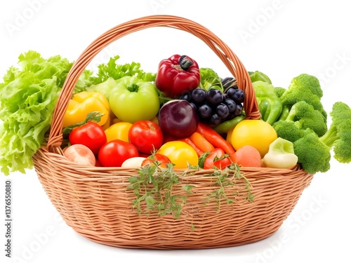 A vibrant harvest overflowing with fresh, colorful fruits and vegetables in a rustic wicker basket, bathed in bright, natural light.
