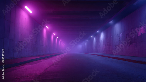 A Vibrant Pink Neon-Lit Tunnel View with Pulsating Lights, Empty Road, and Mystical Atmosphere Perfect for Creative Projects and Modern Aesthetic