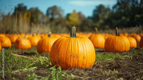 A vibrant pumpkin patch is filled with ripe pumpkins ready for harvest, showcasing the beauty of autumn in a bright, sunny landscape surrounded by nature