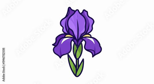 A vibrant purple iris flower with green leaves and yellow accents, rendered in a simple, illustrative style
