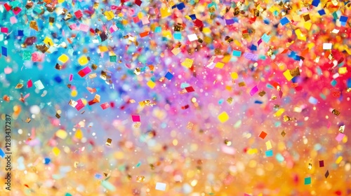A vibrant shower of multicolored confetti falling from above, filling the air with bursts of color at a New Year's Eve celebration.
