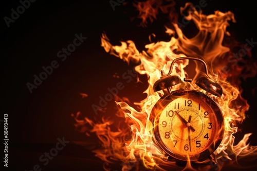 A vintage alarm clock engulfed in flames, rush hour , time runiing out.