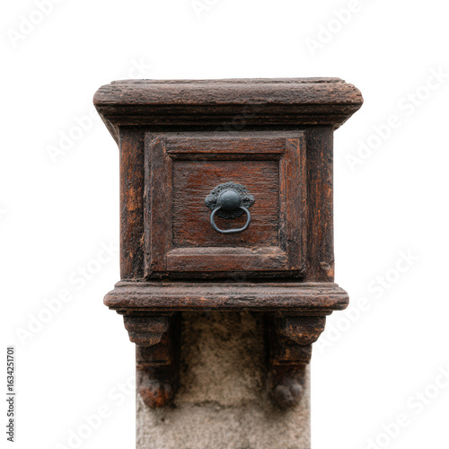 A vintage wooden mail slot mounted on a wall, featuring a classic design with intricate details and a round metal handle, all set against a white isolate background.