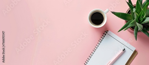 A visually appealing flat lay image featuring a desk workspace with mockup notebooks, a plant, a coffee cup, and empty space on a pastel background.