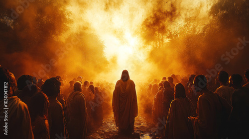 A vivid Bible scene of Jesus performing miracles among a crowd, with people gathered around in awe, bathed in divine light