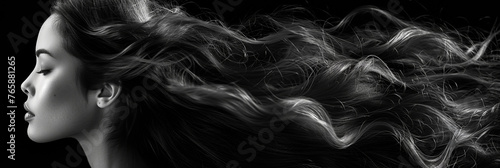 A vogue portrait featuring sensual, flowing long hair against a black backdrop.