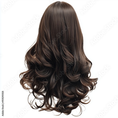 A voluminous, long curly wig for women, in a rich chocolate brown color, isolated on a white background