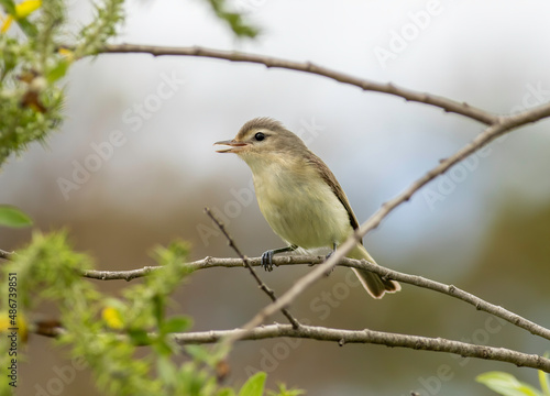 A warbling vireo sits on a twig singing in the cold crisp air during migration season.