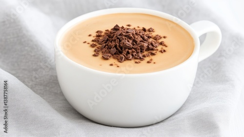 A white mug holds a creamy, light brown dessert topped with chocolate shavings. It rests on a neutral gray fabric. The image is high-quality, with soft, natural lighting. The style is clean and minim