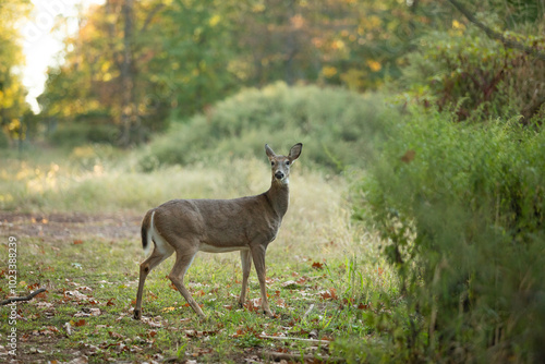 A white-tailed deer doe stands in a clearing in the woods in New Jersey