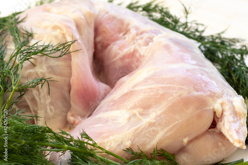 A whole raw rabbit carcass and a bunch of dill on a white plate .