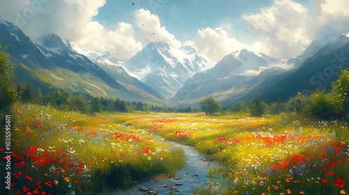 A winding river flows through a lush valley surrounded by towering snow-capped mountains and a bright blue sky.