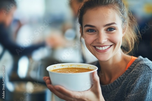 A woman holds a bowl of soup with a bright smile in a vibrant environment, highlighting warmth and satisfaction amidst a shared social dining experience indoors.