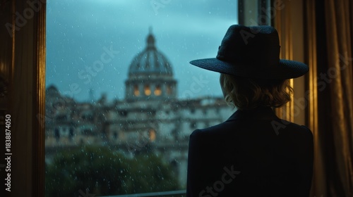 A woman in a dark coat and wide brim hat, blending elegance with cinematic tension. Her calm posture and soft lighting highlight a refined yet mysterious look.