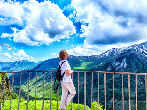 A woman on a balcony admires a stunning mountain range