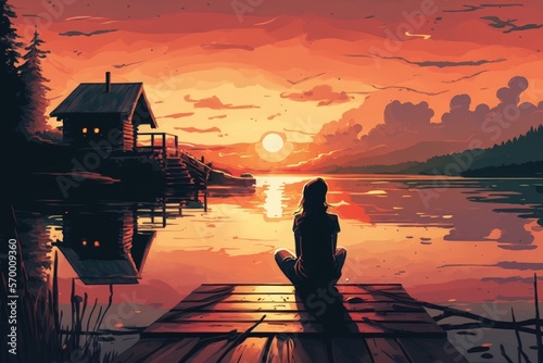 A woman's resting on the water while watching a gorgeous summer sunset. Generative AI