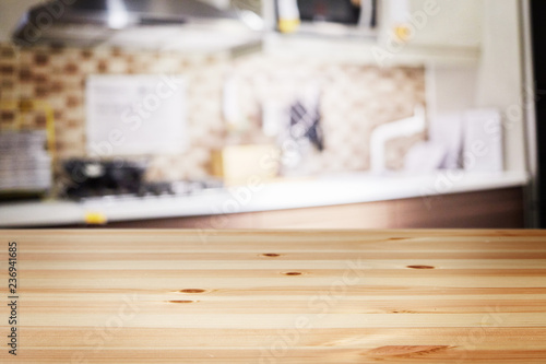 a wooden table with background of blurry interior living room at modern house