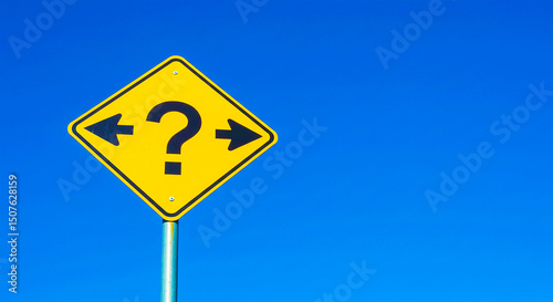 A yellow sign with a question mark and arrows pointing left and right against a clear blue sky day