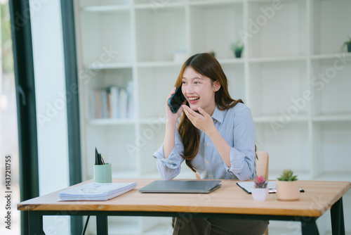 A young Asian businesswoman works alone at a desk with a laptop, stack of papers, and documents. She looks happy and successful, managing accounts and preparing financial statements in daylight.
