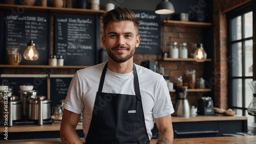 A young Caucasian male barista smiles warmly, wearing an apron in a cozy cafe setting with rustic decor.