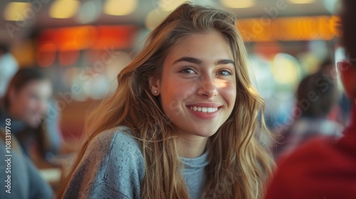 A young, charming female student with long hair and a smile, captured in a close-up, with a university atmosphere and student life vibe.