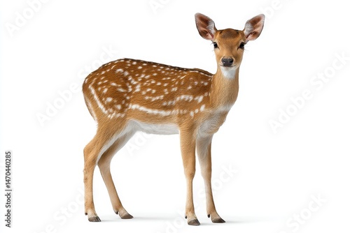 A young deer stands gracefully, showcasing its spotted fur and delicate features against a plain background