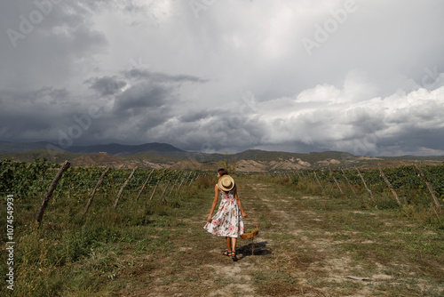 A young girl playing joyfully in a beautiful field with her dog beneath dramatic, stunning skies
