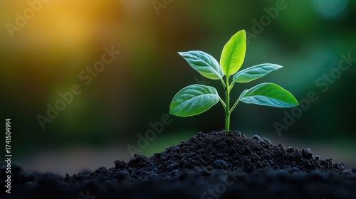 A young green plant with bright leaves emerging from fertile soil. Symbolizes growth, environmental awareness, the environment and sustainable practices.