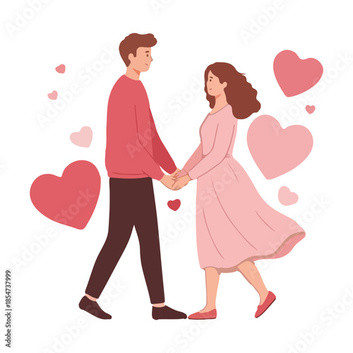 A young romantic couple holding hands and looking at each other surrounded by floating hearts.