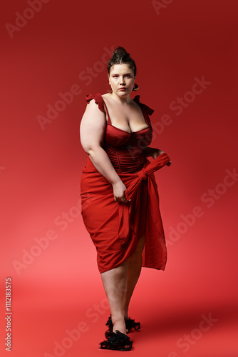 A young woman confidently showcases her style in a stunning red dress that embodies elegance.