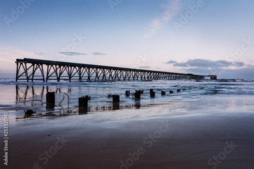 Abandoned industrial pier going out into the sea. Stumps of old abandoned pier in foreground