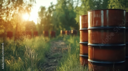 Abandoned Oil Barrels in a Sunlit Forest Setting Surrounded by Lush Greenery and Grass