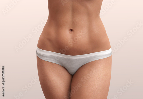Abdominal press. Woman body beauty healthcare. Close up of female body in beige panties.