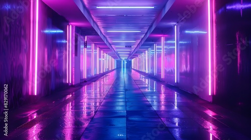 abstract background of futuristic corridor with purple and blue neon lights.