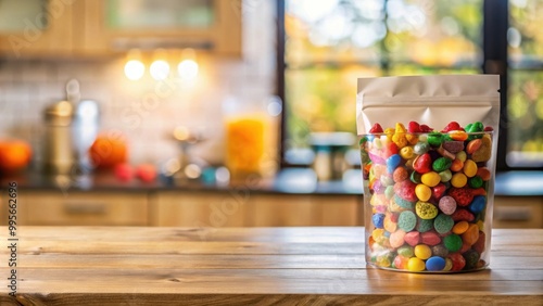 Abstract colorful doypack with various treats on a kitchen table with blurred background, product packaging, packing bag, candy