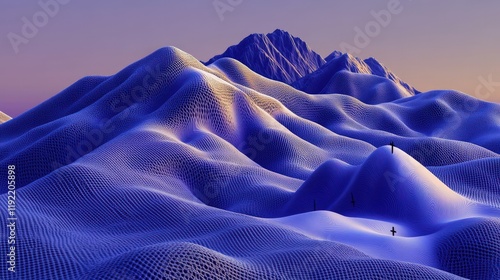 Abstract digital landscape of undulating purple mountains, textured surface, small figures on hills, sunset sky.