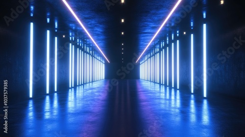 Abstract light tunnel with a blue backdrop featuring a portal illuminated by rays neon lights and spotlights A dark vacant setting showcasing neon elements with a symmetric reflection and perspect
