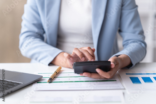 Accountant analyzing business marketing data on paper dashboard Corporate finance office table.