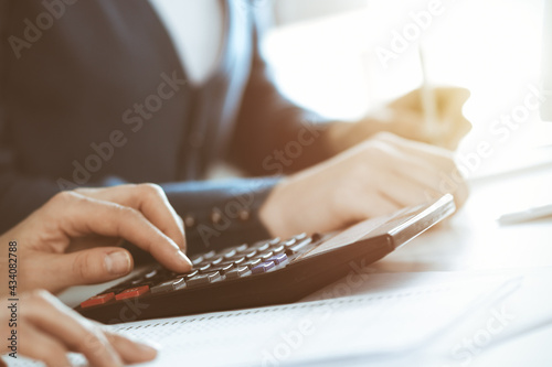 Accountant checking financial statement or counting by calculator income for tax form, hands closeup. Business woman sitting and working with colleague at the desk in office. Tax and Audit concept