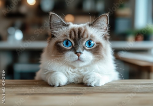 Adorable fluffy cat with striking blue eyes resting on a wooden table, showcasing its playful personality in a cozy and modern home setting