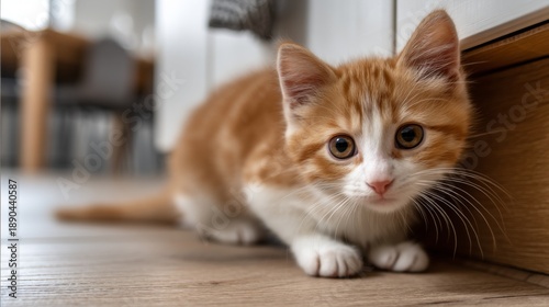 Adorable orange and white kitten crouching on wooden floor, playful expression, soft fur, curious gaze, perfect for pet-related, family, or home themes
