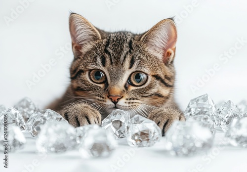 Adorable tabby kitten surrounded by sparkling crystalline gems capturing a playful moment in a cozy indoor setting