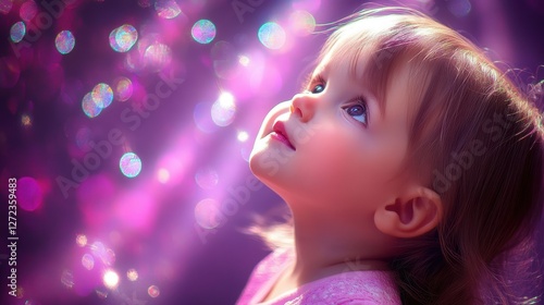 Adorable toddler girl looking up, surrounded by bokeh lights. Perfect for projects needing innocence, wonder, or childhood themes.